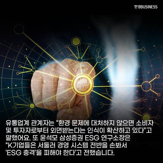 유통업계 관계자는 “환경 문제에 대처하지 않으면 소비자 및 투자자로부터 외면받는다는 인식이 확산하고 있다”고 말했어요. 또 윤석모 삼성증권 ESG 연구소장은 “K기업들은 서둘러 경영 시스템 전반을 손봐서 ‘ESG 충격’을 피해야 한다’고 전했습니다.