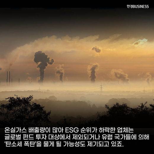 온실가스 배출량이 많아 ESG 순위가 하락한 업체는 글로벌 펀드 투자 대상에서 제외되거나 유럽 국가들에 의해 ‘탄소세 폭탄’을 물게 될 가능성도 제기되고 있죠.