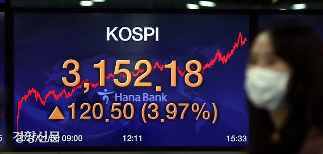 코스피가 3152.18로 3100선을 돌파하며 사상 최고치를 경신한 8일 서울 중구 명동 하나은행 본점 딜링룸 전광판에 코스피 종가가 표시돼 있다.