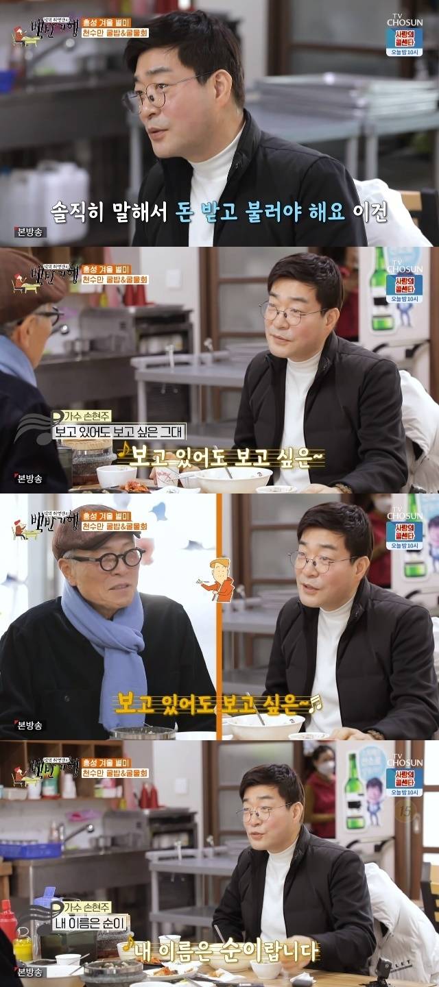 손현주는 "그걸로 손현주라는 사람이 일반 시청자들에게 많은 사랑을 받았다. 그때 당시 1집, 2집 앨범도 냈다. 저 2집 가수다"라고 자랑했다. 손현주는 "솔직히 말해서 돈 받고 불러야 한다고 너스레를 떨며 자신의 앨범곡 '보고 있어도 보고 싶은 그대', '내 이름은 순이'를 들려줘 눈길을 끌었다. (사진=TV조선 '식객 허영만의 백반기행' 캡처)