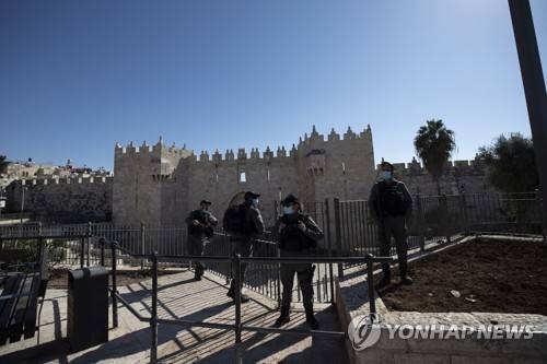 epa08926042 Israeli border police guarding near the Old city of Jerusalem during a full lockdown in Israel, 08 January 2021. Although Israel is one of the first countries to receive vaccines and has so far vaccinated one and a half million citizens, the rate of infection of the virus is rising drastically and Israel enter a full closure of two weeks. EPA/ATEF SAFADI