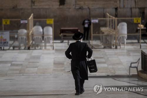 epa08926049 An Ultra-Orthodox Jewish praying in separated partitions at the Prayer Plaza in front of the Western Wall in the Old City of Jerusalem during a full lockdown in Israel, 08 January 2021. Although Israel is one of the first countries to receive vaccines and has so far vaccinated one and a half million citizens, the rate of infection of the virus is rising drastically and Israel enter a full closure of two weeks. EPA/ATEF SAFADI