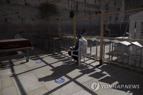 epa08926048 An Ultra-Orthodox Jewish praying in separated partitions at the Prayer Plaza in front of the Western Wall in the Old City of Jerusalem during a full lockdown in Israel, 08 January 2021. Although Israel is one of the first countries to receive vaccines and has so far vaccinated one and a half million citizens, the rate of infection of the virus is rising drastically and Israel enter a full closure of two weeks. EPA/ATEF SAFADI