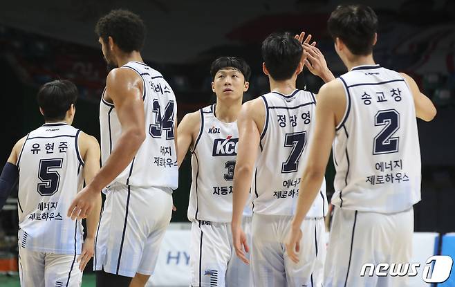 (부산=뉴스1) 여주연 기자 = 8일 오후 부산 사직실내체육관에서 열린 '2020~2021 현대모비스 프로농구' 부산KT와 전주KCC 경기에서 KCC 선수들이 득점 후 기쁨을 나누고 있다. 2021.1.8/뉴스1