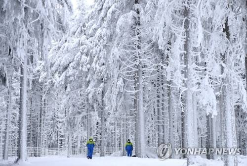 Coaches stand under snow covered trees during the women's 7.5 km sprint race at the Biathlon World Cup in Oberhof, Germany, Friday, Jan. 8, 2021. (AP Photo/Matthias Schrader)