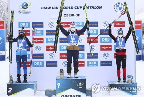 Winner Tiril Eckhoff of Norway, center, runner up Hanna Oeberg of Sweden, left, and Austria's Lisa Theres Hauser who finished third celebrate on the podium after the women's 7.5 km sprint race at the Biathlon World Cup in Oberhof, Germany, Friday, Jan. 8, 2021. (AP Photo/Matthias Schrader)