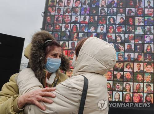 epa08926092 Relatives of crew members of the Ukraine International Airlines Flight PS752 which crashed near Tehran a year ago react during a commemorative ceremony in Kiev, Ukraine, 08 January 2021. A Ukrainian International Airlines passenger plane was downed by Iranian armed forces on 08 January 2020 near Tehran, killing all 176 people aboard, after allegedly mistaking it for an incoming missile. EPA/SERGEY DOLZHENKO