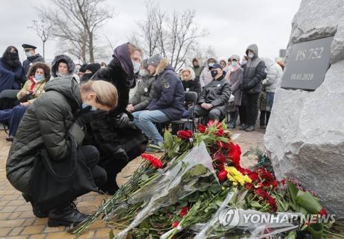 epa08926137 Relatives, colleagues, and friends of crew members of the Ukraine International Airlines Flight PS752 which crashed near Tehran a year ago react during a commemorative ceremony in Kiev, Ukraine, 08 January 2021. A Ukrainian International Airlines passenger plane was downed by Iranian armed forces on 08 January 2020 near Tehran, killing all 176 people aboard, after allegedly mistaking it for an incoming missile. EPA/SERGEY DOLZHENKO