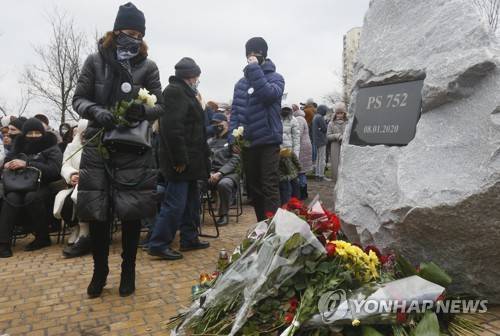 People lay flowers to a memorial in Kyiv, Ukraine, Friday, Jan. 8, 2021, for the victims of a Ukrainian 737-800 plane crash on the outskirts of Tehran. One year after Iranian forces shot down a Ukrainian jetliner, killing all 176 people on board, more questions remain than answers as families of victims allege harassment by Iranian authorities and affected countries raise concerns about the lack of transparency and accountability in Iran's investigation. (AP Photo/Efrem Lukatsky)
