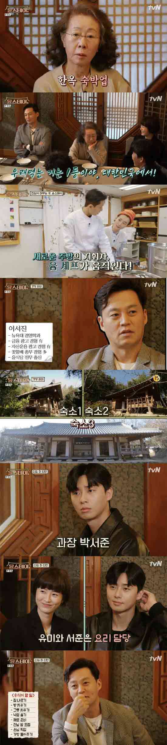 8일 오후 첫 방송된 tvN 예능 프로그램 '윤스테이'에서는 윤여정, 이서진, 박서준, 정유미, 최우식이 첫 만남을 갖는 모습이 전파를 탔다.