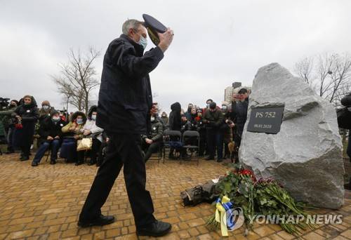 A pilot lays flowers at a memorial in Kyiv, Ukraine, Friday, Jan. 8, 2021, for the victims of a Ukrainian 737-800 plane crash on the outskirts of Tehran. One year after Iranian forces shot down a Ukrainian jetliner, killing all 176 people on board, more questions remain than answers as families of victims allege harassment by Iranian authorities and affected countries raise concerns about the lack of transparency and accountability in Iran's investigation. (AP Photo/Efrem Lukatsky)