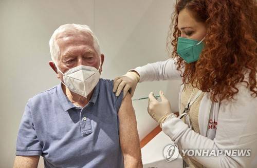 Helena Weritschew, medical employee, vaccinates Karlheinz Blomenkamp (82), pensioner, in the Corona vaccination centre in the exhibition halls in Hamburg, Germany, Friday, Jan.8, 2021. (Georg Wendt/dpa via AP)