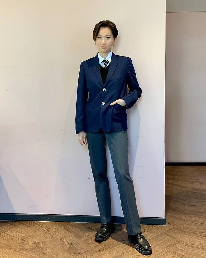 사진에는 바지 교복을 입고 멋지게 포즈를 취하고 있는 장윤주의 모습이 담겨있다. 톱모델의 완벽한 교복 핏이 시선을 사로잡는다.