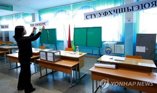 epa08926170 Members of the electoral commission prepare a polling station for the upcoming early presidential elections and a referendum on changes in the constitution in the village of Besh-Kungei near Bishkek, Kyrgyzstan, 08 January 2021. Presidential elections and a referendum on the form of government in Kyrgyzstan will be held on 10 January 2021. EPA/IGOR KOVALENKO
