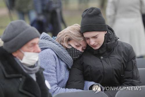 epa08926175 Relatives, colleagues, and friends of crew members of the Ukraine International Airlines Flight PS752 which crashed near Tehran a year ago react during a commemorative ceremony in Kiev, Ukraine, 08 January 2021. A Ukrainian International Airlines passenger plane was downed by Iranian armed forces on 08 January 2020 near Tehran, killing all 176 people aboard, after allegedly mistaking it for an incoming missile. EPA/SERGEY DOLZHENKO