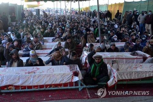 epa08926177 Members of the Shiite Hazara community gather around coffins of victims as they refuse to bury them for the last five consecutive days, during a protest on the outskirts of Quetta, Balochistan province, Pakistan, 08 January 2021. At least 11 coal miners were killed in the Mach area of Balochistan on 03 January, after armed militants kidnapped them and took them to a nearby area before opening fire at close range. EPA/JAMAL TARAQAI