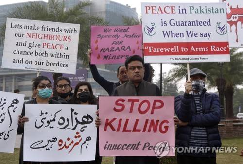 Supporters of a civil society organization hold a demonstration to protest against the killing of coal mine workers by gunmen near the Machh coal field, in Lahore, Pakistan, Friday, Jan. 8, 2021. Pakistan's prime minister Friday appealed the protesting minority Shiites not to link the burial of 11 coal miners from Hazara community who were killed by the Islamic State group to his visit to the mourners, saying such a demand amounted to blackmailing the country's premier. (AP Photo/K.M. Chaudary)