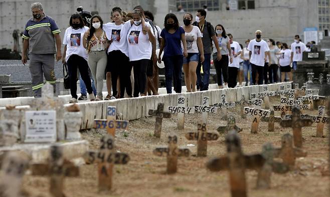지난 5일(현지시간) 브라질 동남부 리우데자네이루 한 공동묘지에서 열린 기마랑이스 장례식에서 가족과 친척, 친구들이 그의 죽음을 슬퍼하고 있다. 기마랑이스는 전날 오토바이를 타고 슬럼가 옆을 지나다 총을 맞고 숨졌다. 아들을 학교에 데려다주고 가는 길이었다. 가해자는 경찰로 밝혀졌다.