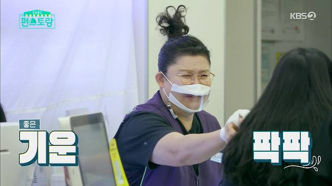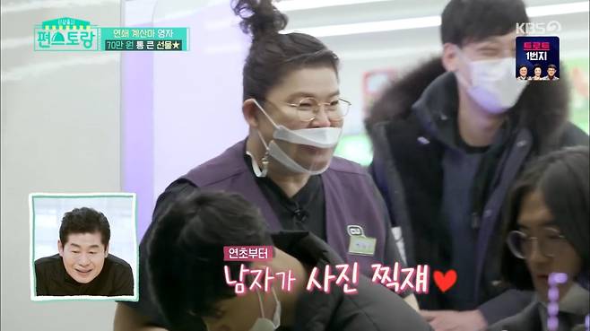 학생들에게 신메뉴 아이디어를 듣던 이영자는 "팬인데 사진 같이 찍자"는 남성 팬의 말에 "신년부터 남자가 사진 찍쟤"라며 즐거워했다.