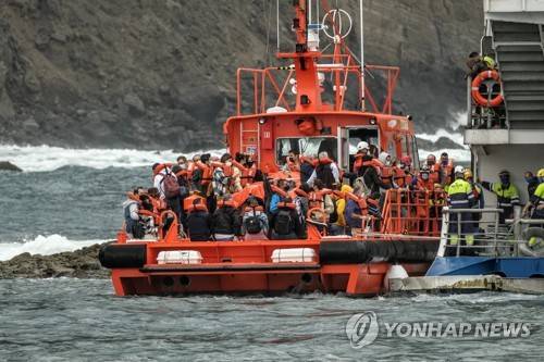 epa08926193 Rescue Services vessel Salvamar Nunki evacuates passengers from the Bentago Express ferry of Norwegian company Fred Olsen, stranded near Agaete docks in Gran Canaria, Spain, 08 January 2021. The ferry stranded at 21.00 the previous day after being pushed by strong wind. The 75 people on board the vessel were evacuated 08 January 2021 without any injuries. EPA/Angel Medina G.