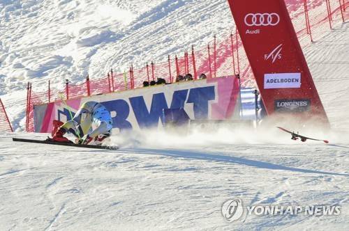 Norway's Lucas Braathen falls at the finish line during an alpine ski, men's World Cup giant slalom, in Adelboden, Switzerland, Friday, Jan.8, 2021. (AP Photo/Marco Tacca)