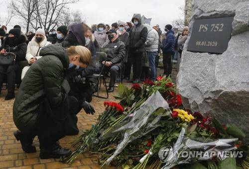 People lay flowers to a memorial in Kyiv, Ukraine, Friday, Jan. 8, 2021, for the victims of a Ukrainian 737-800 plane crash on the outskirts of Tehran. One year after Iranian forces shot down a Ukrainian jetliner, killing all 176 people on board, more questions remain than answers as families of victims allege harassment by Iranian authorities and affected countries raise concerns about the lack of transparency and accountability in Iran's investigation. (AP Photo/Efrem Lukatsky)