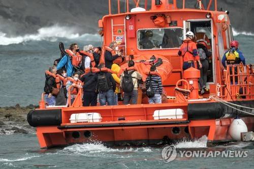 epa08926218 Rescue Services vessel Salvamar Nunki evacuates passengers from the Bentago Express ferry from Norwegian company Fred Olsen, stranded near Agaete docks in Gran Canaria, Spain, 08 January 2021. The ferry stranded at the previous evening after being pushed by strong wind. The 75 people on board of the vessel were evacuated 08 January 2021 without any injuries. EPA/Angel Medina G.