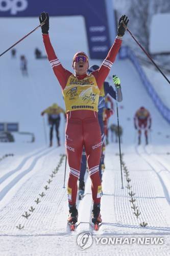 Russia's Alexander Bolshunov celebrates after winning a Tour de Ski, men's 15-kilometer mass start classic cross-country ski event in Val di Fiemme, Italy, Friday, Jan. 8, 2021 (AP Photo/Alessandro Trovati)
