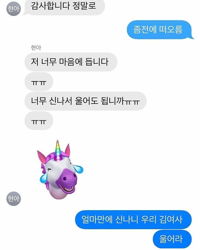 공개된 사진 캡처에는 싸이와 현아가 나눈 메시지 내용이 담겨있다. "감사합니다. 정말로. 너무 마음에 듭니다. 너무 신나서 울어도 됩니까?"라는 현아의 말에 싸이는 "얼마 만에 신나니. 울어라"라고 답하며 애틋함을 보였다.