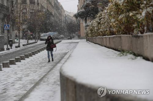 epa08926231 A woman walks on a snow-covered street in downtown in Madrid, Spain, 08 January 2021. A total of eight parks will be closed to public in the Spanish capital as a red warning has been issued in Madrid because of heavy snowfalls expected due to storm Filomena that has already caused a big drop in temperatures and snowfalls throughout Spain except for the Canary Islands. EPA/Rodrigo Jimenez
