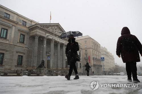 epa08926236 People walk during a heavy snow fall in front of the Lower House in downtown in Madrid, 08 January 2021. A total of eight parks will be closed to public in the Spanish capital as a red warning has been issued in Madrid because of heavy snowfalls expected due to storm Filomena that has already caused a big drop in temperatures and snowfalls throughout Spain except for the Canary Islands. EPA/Rodrigo Jimenez