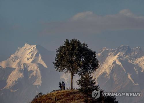 epa08926238 Nepalese youths take pictures of range of Ganesh himal during a clear weather in Kathmandu, Nepal, 08 January 2020. EPA/NARENDRA SHRESTHA