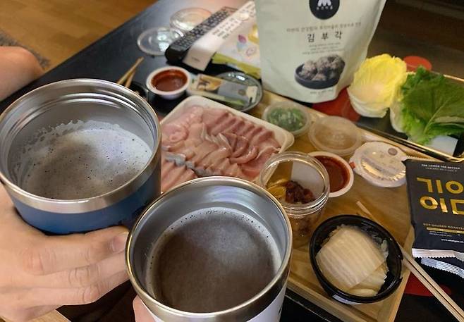 공개된 사진에는 이현이와 남편이 함께 맥주와 회를 즐기는 모습이 담겨있다.