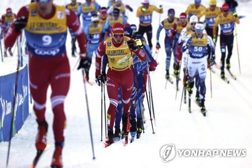 Russia's Alexander Bolshunov, center, competes on his way to win a Tour de Ski, men's 15-kilometer mass start classic cross-country ski event in Val di Fiemme, Italy, Friday, Jan. 8, 2021 (AP Photo/Alessandro Trovati)