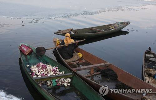 epa08926256 A Kashmiri woman inside a small boat on the waters of Nageen Lake on sunny day in Srinagar, the summer capital of Indian Kashmir, 08 January 2021.The weather has improved in Indian Kashmir after recent heavy snowfall. The region?s air connectivity has been restored and efforts are on to restore road connectivity also. EPA/FAROOQ KHAN