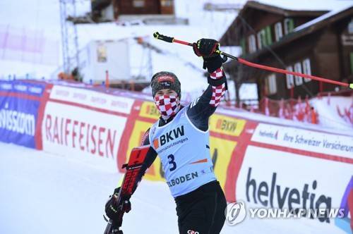 Croatia's Filip Zubcic celebrates after an alpine ski, men's World Cup giant slalom, in Adelboden, Switzerland, Friday, Jan.8, 2021. (AP Photo/Marco Tacca)
