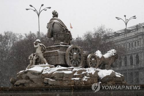 epa08926268 Snow covers La Cibeles fountain in downtown Madrid, Spain, 08 January 2021. A total of eight parks will be closed to public in the Spanish capital as a red warning has been issued because of heavy snowfalls expected due to storm Filomena that has already caused a big drop in temperatures and snowfalls throughout Spain except for the Canary Islands. EPA/MARISCAL