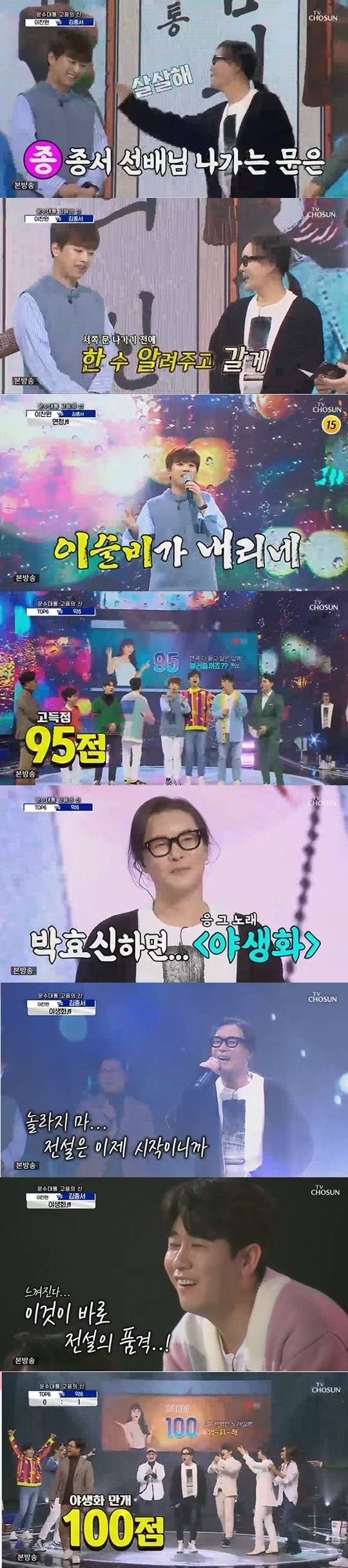 이날 가장 먼저 김종서와 이찬원이 대결을 펼쳤다. 이찬원은 김종서 3행시를 지었다며 “김종서 선배님, 종서 선배님 나가는 문은, 서쪽입니다”라고 견제했다. 이에 김종서는 “나가기 전에 한 수 알려주고 갈게”라고 받아쳤다. 이찬원은 “나훈아 선생님 노래를 했을 때 성적이 좋더라. ‘연정’이라는 곡을 준비했다”고 밝혔다. 이찬원은 95점을 받았다.