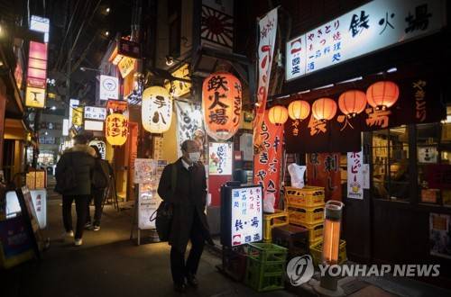 A man walks through an alley filled with restaurants and bars on the first day of a coronavirus state of emergency in Tokyo on Friday, Jan. 8, 2021. Japan declared a state of emergency in Tokyo and three nearby prefectures Thursday, as coronavirus cases continued to surge in the nation. The declaration asks restaurants and bars close by 8 p.m. while drinks won't be served after 7 p.m. (AP Photo/Hiro Komae)