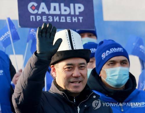 epa08926294 Presidential candidate Sadyr Japarov attends a rally with voters on a square in Bishkek, Kyrgyzstan, 08 January 2021. Presidential elections and referendum on the form of government in Kyrgyzstan will be held on 10 January 2021. EPA/IGOR KOVALENKO