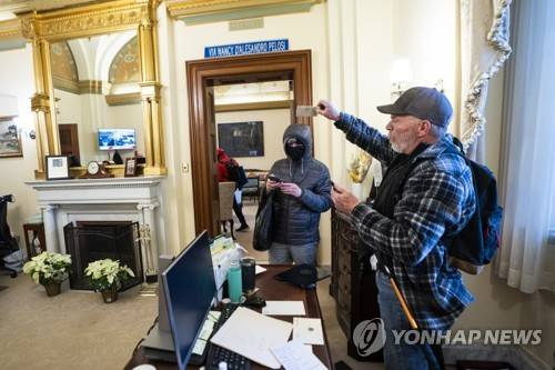epa08926296 Richard Bigo Barnett (R), a supporter of US President Donald J. Trump and his baseless claims of voter fraud, takes an envelope off a desk in the office of Speaker of the House Nancy Pelosi after breaching Capitol security during a protest against Congress certifying Joe Biden as the next president in Washington, DC, USA, 06 January, 2020 (issued 08 January 2020). On 08 January Assistant House Speaker Katherine Clarke said the House will move to impeach President Trump if the Vice President and Cabinet do not remove him on their own. EPA/JIM LO SCALZO