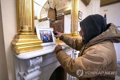 epa08926302 A supporter of US President Donald J. Trump and his baseless claims of voter fraud walks through the office of Speaker of the House Nancy Pelosi after breaching Capitol security during their protest against Congress certifying Joe Biden as the next president in Washington, DC, USA, 06 January 2020 (issued 08 January 2020). On 08 January Assistant House Speaker Katherine Clarke said the House will move to impeach President Trump if the Vice President and Cabinet do not remove him on their own. EPA/JIM LO SCALZO