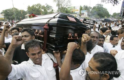 FILE - In this Monday, Jan. 12, 2009, file photo, Sri Lankans shout slogans against the government during the funeral procession of the Sunday Leader newspaper editor Lasantha Wickrematunge, in Colombo, Sri Lanka. The daughter of the slain journalist filed a complaint Friday, Jan. 8, 2021, with the United Nations Human Rights Committee over alleged government involvement in her father’s death 12 years ago. The San Francisco-based Center for Justice and Accountability filed the complaint on behalf of Ahimsa Wickrematunge, the daughter of Lasantha, who was allegedly killed by a military-linked hit squad while driving to work on Jan. 8, 2009. (AP Photo/Gemunu Amarasinghe, File) MONDAY, JAN. 12, 2009, FILE PHOTO