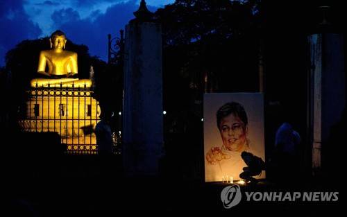 FILE - In this Tuesday, Jan. 8, 2013, file photo, family members and friends light candles next to a portrait of slain newspaper editor Lasantha Wickrematunge, on his fourth death anniversary in Colombo, Sri Lanka. The daughter of the slain journalist filed a complaint Friday, Jan. 8, 2021, with the United Nations Human Rights Committee over alleged government involvement in her father’s death 12 years ago. The San Francisco-based Center for Justice and Accountability filed the complaint on behalf of Ahimsa Wickrematunge, the daughter of Lasantha, who was allegedly killed by a military-linked hit squad while driving to work on Jan. 8, 2009. (AP Photo/Gemunu Amarasinghe, File) JAN. 8, 2013, FILE PHOTO
