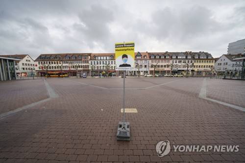 A sign "Stop Corona" on the market place appeals to the citizens and reminds them of the mask duty in this area in Hanau, Germany, Friday, Jan.8, 2021. (Frank Rumpenhorst/dpa via AP)