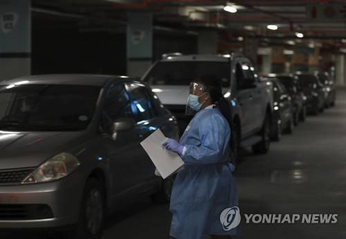 A health-care worker directs vehicles as patients queue for COVID-19 testing at a Dis-Chem drive-through testing station at the Table Bay Mall in Cape Town, South Africa, Friday, Jan. 8, 2021. South Africa with 60 million people has reported by far the most cases of the coronavirus in Africa, with more than 1.1 million confirmed infections. (AP Photo/Nardus Engelbrecht)
