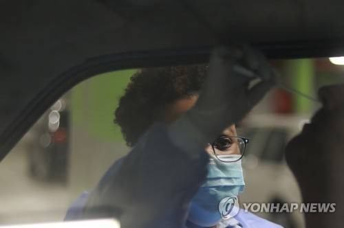 A health-care worker takes a nasal swab for COVID-19 testing at a Dis-Chem drive-through testing station at the V&A Waterfront in Cape Town, South Africa, Friday, Jan. 8, 2021. South Africa with 60 million people has reported by far the most cases of the coronavirus in Africa, with more than 1.1 million confirmed infections. (AP Photo/Nardus Engelbrecht)