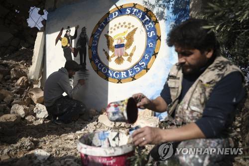 Syrian graffiti artist Aziz Al-Asmar, front, finishes work on his depiction of the events in Washington after the US president Donald Trump's supporters stormed the Capital, on a wall of a house destroyed in an airstrike, in Binish, Idlib province, Syria, Friday, Jan. 8, 2020. (AP Photo/Ghaith Alsayed)