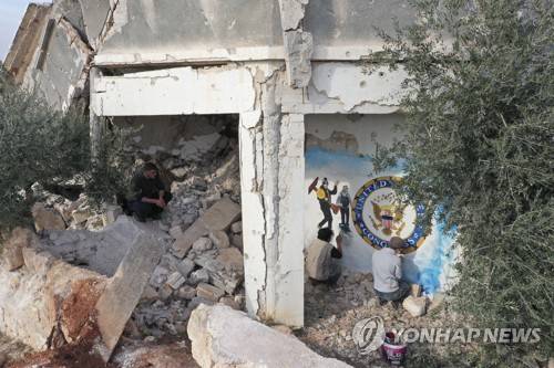 Syrian graffiti artist Aziz Al-Asmar, center, finishes work on his depiction of the events in Washington after the US president Donald Trump's supporters stormed the Capital, on a wall of a house destroyed in an airstrike, in Binish, Idlib province, Syria, Friday, Jan. 8, 2020. (AP Photo/Ghaith Alsayed)