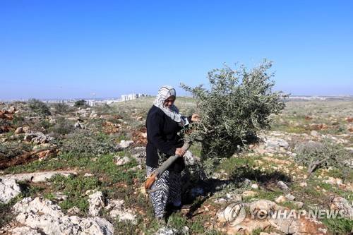 epa08926361 A Palestinian olive farmer checks damages to her olive trees that were allegedly cut down by Israeli soldiers near her village of Der- Balout, near the West Bank City of Salfit, 08 January 2021. residents of the village claim more than 300 olive trees were cut down by the soldiers. EPA/ALAA BADARNEH